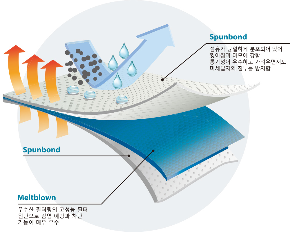 SS(MM)S 원단 구조 (Spunbond + Meltblown + Spunbond)